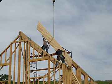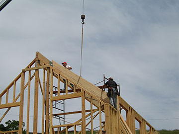 After lunch, the beam for the shed section of the roof is lifted up to be positioned in its bucket. |