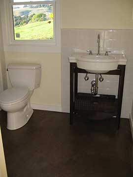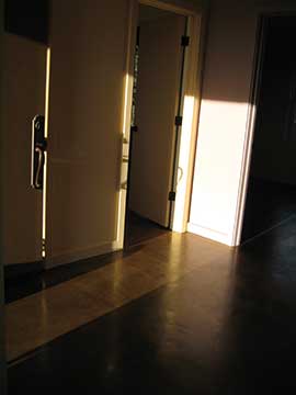 After my morning meeting, I came back and spent the afternoon polishing the floor in the guest cottage. Todd Jersey told me not to use acrylic sealer on the stained floor, because if there was any moisture in the slab, it would come to the surface and cloud the sealer. He had recommended paste wax, so I had gotten some extremely PC, environmentally sound, no VOC’s paste wax to put on the floor. The previous Friday, I had cleaned and mopped the floor and Kai had kept everyone out until today. I mopped it again in the morning before I went to my weekly meeting and spent the afternoon waxing and polishing. The floor really came out great. |