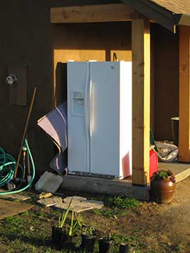 Several weeks ago, we picked up my mom’s old fridge at her ranch. It was only a year or two old when she remodeled her ranch and got a fancy new fridge (which I don’t think she likes too much.) Anyway, she gave us her used one. Unfortunately, her contractors had used it for a job fridge and it is pretty grubby, including splashes of concrete on one side. Somehow, cleaning it is just tremendously unappealing—especially without any hot water. I have decided to pace myself and have cleaned the outside—except for the door handles, which are stubborn. I will tackle the inside next week. Meanwhile, it lends the cottage porch a distinctly WT housing* kind of look . All we need now is a car on blocks.