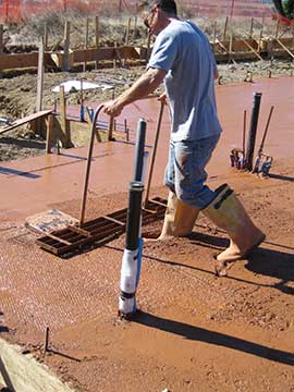 Here you get a good shot of how they level the slab. The board on the left is sitting on wires which are hooked to pieces of rebar thrust through the void-form into the ground. The wires have been leveled off in advance using a string across the forms. The concrete is pumped into the space between the form and the board and then screeded flat with a piece of 2 x 4 run between the board in the foreground and form edge. |