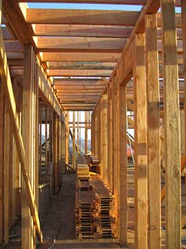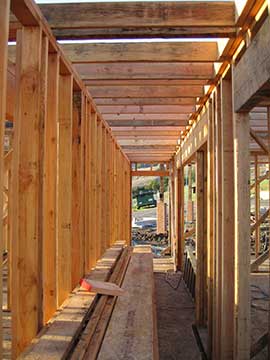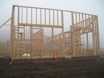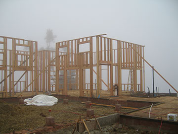 This morning I arrived at the site about 7:40 am in a dense fog. Everything was very ghostly—appropriate for Halloween. The crew was at work putting rafters on the east wing of the house. | |