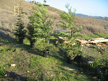My own private redwood grove . . .thanks to Costco! These trees will be planted on the knoll you can see behind them in the photo, to block the view from our neighbors up the hill. | |