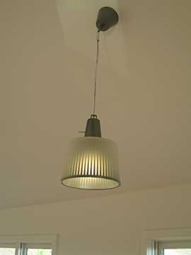 These fixtures go down the middle of the ceiling and I think they are very handsome. The electrician found them as a substitute for some ridiculously expensive fixtures. They have little perforations which the light shines through. | |