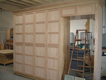 Last Monday, I had gone to the cabinet makers to view another stain sample for the kitchen cabinets. They had the pantry cupboard almost complete as you can see here. I am so excited at the way the cabinetry is coming out. I find this strap design so handsome. The hole is where the refrigerator will go—and if you notice the little cabinet above it, you can get a sense of the scale. These puppies are tall! |