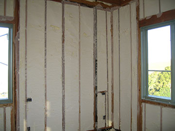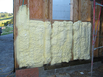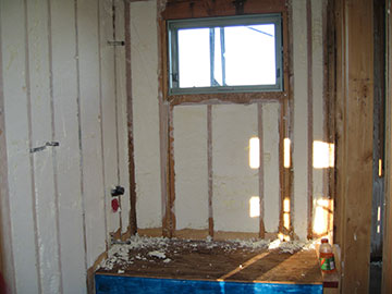 Here is our guest bath, complete with blue tub, and plenty good insulation. Icynene has a very high R-value, much higher than batt insulation. Very commonly used in the midwest and northeast, it is less used in California because of our warmer climate, but is not that much more expensive than batt and is vastly superior. It will help save greatly on heating and make the house more comfortable during the summer as well, since we are not installing air conditioning. We used a soy-based version in the cottage and really love it. |