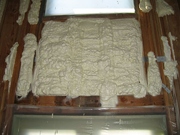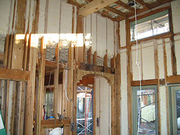 Looking from the living room toward the foyer, the rooms really did take on a very Tudor feel—which I actually kind of liked. The foam is also being installed on the underside of the roof in a double layer, for an R-factor of 38. This should help immensely to keep the house comfortable during the summer months when the sun will beat down on the roof. |