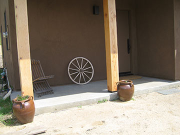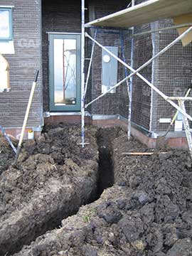 This ditch outside the foyer and living room doors is to connect the electricity up to the house. That gray box on the wall above the end of the ditch is the main panel for the house. The white circle in the middle of the box is a meter, but no one will ever read it because the main panel in the utility shed up by the water tank is where meters get read. |