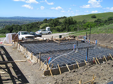 In the foreground you can see a piece of equipment. This is a concrete pump used to pump the concrete off the trucks to wherever the concrete workers want it. Although I had an appointment to go to in Berkeley, I waited as long as I could in hopes of seeing part of the guest cottage pour, but before it was time for me to go, the guy hauling the pump left, telling me the pour for that day had been cancelled. FYI, the finisher on the barn slab was a woman. |