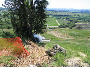 Looking down at the pond from an area that will be at the corner of the house. The tan stuff on the ground is chips the tree trimmers left from pruning the bay tree. I wanted them to put the chips down the hill by the pond, but I wasn't able to be at the site when they came, so it was a done deal by the time I got there. The ugly orange fence is to let the workers know that that area is off limits. Out of the photo to the left, there are some very cool rocks with lots of lichen on them. We don't want anyone tramping through that area or throwing garbage in it. When the grading contactor for the dam was here, we had them fence it off too; but they took machinery through to rip-rap the gully and caused some damage. Kai Clark, our superintendant, won't let that happen again. |