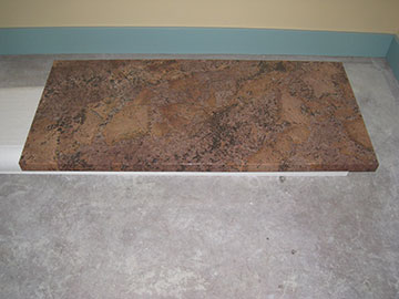 We had a large scrap of granite left from our counters which we had made into a base for our stove. The stove only adjusts to 37" maximum height and the counters are 38" high. We had planned to put a piece of plywood under the stove to raise it enough to match the counter height, but that was going to look extremely ugly, since the range has open legs. We had the counter guys make this base to cover the plywood. It has a laminated return which will conceal the front edge of the plywood and look very nice under the stove. The plywood and granite combined will raise the stove 1 1/2" which will give us some wiggle room to adjust the legs to the correct height. |