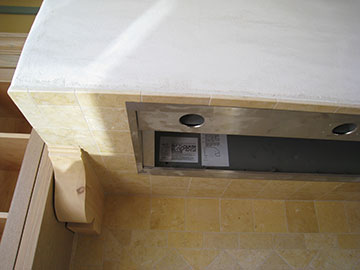Here is a closer look at the range hood after the clean-up of plaster on Wednesday. Kai also installed the guts of the blower. It will have a screen over the hole, but except for that, this is how it will look in action. | |