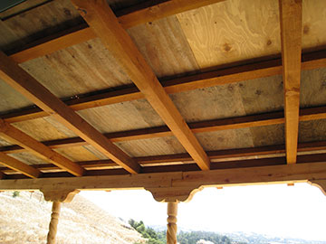 I took these pictures of the veranda with the plywood on from underneath to get an idea of how it would seem once the real roof goes on. | |