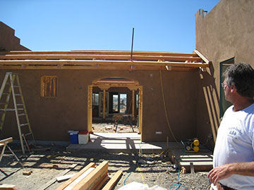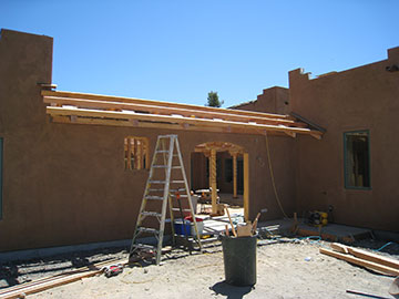 More of the latillas got nailed on today. I am so happy I insisted that the pine get sealed with the clear stain. The contrast with the Douglas fir which is stained sort of orange-ish is really sharp and it would have looked stupid if we had used the same stain on both woods but they turned out two different colors of orange. I really did not like the orange but it has a 6-year warranty where the clear will have to be redone every two years or so. And, the Doug fir is kind of orange-ish anyway, so I have learned to live with it. |