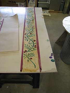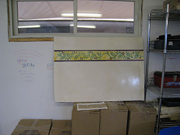 We were gone for the weekend to a work event for Jim and on the way home on Sunday, I stopped at the site to practice the garland I intend to paint on the range hood. The plaster contractor had left me 3 color samples and told me to practice on them. He had put wax on half of each sample so I could see how it looked and suggested I practice on both the raw plaster and waxed parts to see whether the paint went on better on one or the other. What I discovered is that it is easier to paint on the waxed side, but the paint comes off very easily. The contractor had said that we could wax again over the paint, but I am not sure that the paint would stay in place for the waxing process. |