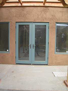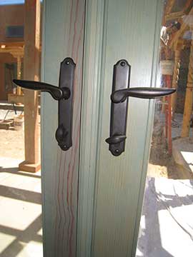 On Wednesday, I arrived at the site to find that the exterior doors had been fitted with door knobs. All the knobs are lever knobs. The exterior doors came with knobs and there were only a few styles to select from. We liked these the best, and really, they are quite attractive. | |