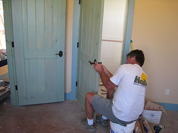 Kai was putting in the interior door knobs after finishing the exterior ones. These we picked out to coordinate with the exterior ones although they are not the same. We had a lot of angst over the knobs. I had seen a photo of a knob I liked and was all set to order it, but wanted to show it to Jim. We went to look at it in person and hated it. It was a cast bronze knob and we think they changed the cast slightly from the version shown in their older catalogue. I since have seen two sample knobs in this style—supposedly the same but looking very different. Since we weren’t exactly sure which version was current what we would end up with, we went with this style instead. |