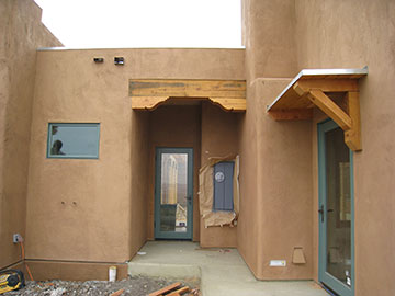 Here is the shade over the guest bedroom window. Only the window on the west side gets a shade, since the other window faces north and doesn’t ever get direct sun. The finished shade will have the 4 x 4’s perpendicular to the house evenly distributed with lengths of latilla set parallel to the house across them. To see what it will look like, you can look at the master bath shade photo on Wednesday’s page. It’s almost to the bottom of page 1. |