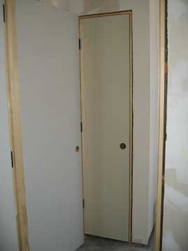 The sliding doors for the closet have been installed and they are nice and sturdy. Light-weight sliders just don’t slide that well, so it’s important to have reasonably heavy ones if they are to work well. |