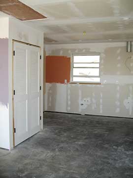 Here you can see how nice they look in the room. Before the closet was drywalled, it looked fairly insignificant, but after the drywall went on, it seemed to loom into the room. With the doors on, it kind of disappears and once the refrigerator goes in next to it, I think it will fit in even better. In this picture, the paint sample on the wall seems almost tomato red, but in real life, it is a great terra cotta. |