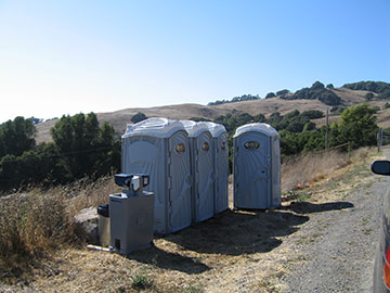 The porta-potties arrived from The Royal Flush, an excellent company that keeps the porta-potty we normally have clean and useable. The also lent us the hand-washing station that you see next to the row of porta-potties. Lurking behind it is one of the galvanized steel garbage cans I bought because they are less likely to blow away in our wind. |