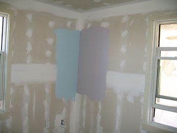 Back in the cottage bedroom, I am working on another iteration of the bedroom colors. They look very pastel-y in this picture, but in real life the colors are more subtle. I had discussed the problem with my color consultant at the party and his suggestion is that both colors need to be about the same value. I think I arrived at that here and they look fairly good, but I still want Jim to render judgment. |