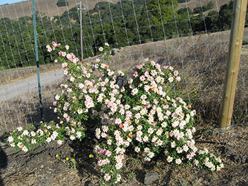I took this picture of one of the Phyllis Bide roses we planted on the fence earlier this spring, because it is growing so lushly. All the roses we put in the ground are going great guns. I can’t wait to get the rest in. I am thinking that I should put some of the Sally Holmes roses—of which I have quite a few—around the back of the barn and guest cottage along the top of the bank. |