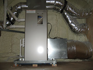 The guest cottage got its furnace! It is tucked up against the south wall in the attic. It looks so tidy and symmetrical, like something in an installation instruction book. These guys just do a great job. |