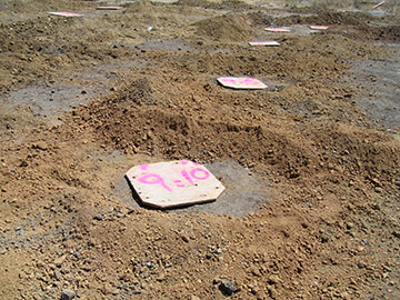The thing that amazed me is the variety of the soil colors. They show somewhat in this photo, but in real life, the color range is even greater. The is yellow on the left, red in the middle and tobacco brown near the saw horses and black in the foreground on the right. The tobacco brown near the saw horses is the most beautiful color. I want the floor of the house to be exactly that color! The other thing that shows up in this shot is the big bare space in the middle where there are no holes. The reason for the bare spot is that the house will be built around a courtyard where there won’t be any piers. |