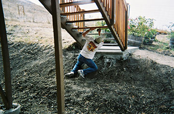 These pictures are actually from August 12th, but they did not get put up with their correct date. Because of the span of the stairs and the way they are built, when you went up the steps, the wood bowed quite a bit. Although this was not a safety issue, my cousin Chris was concerned that several people on the stairs might cause problems. He went to the hardware store and bought some perforated steel bar, which he bolted to the underside of the treads of the wood stairs. |