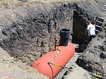Here is our new 5oo gallon propane tank in its hole. Lawrence, who will be in charge next week because Kai is going on vacation, is down in the hole with the tank. He is quite a big guy, which gives you some idea of the scale of the hole. By the time this picture was taken, the inspector had come and given us an OK to bury it (with one minor change which the propane company made this afternoon.) We had decided to go with one of the companies which services our neighbors to save wear and tear on the road, and had thought to get a 1000 gallon tank, but were talked into this smaller tank by the company we chose. |