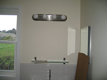 Here is the dreadful light fixture they put up in the bathroom of the cottage until the real one arrives. It doesn’t look as bad in this picture as it really is, believe me. | |