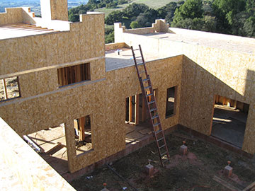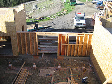 They have framed in the front wall. I am SO happy we redesigned it. If Thomas hadn’t put up the extra ear, we would have arrived at the site one day to find we were moving into the Alamo. The original wall was going to be as tall as the parapet of the building on the right in this picture. Whew! What a lucky escape! The wall will be filled with solid insulation so that it does not need to be vented. The vents were problematic design-wise and were causing everyone headaches. Janver’s suggestion to just fill the wall with solid insulation so it didn’t need any venting was met with relief by all. |
