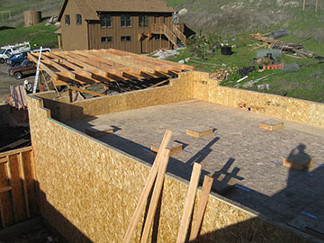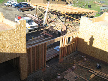 You can see the skylights installed on the utility wing roof. They are covered with plywood to keep them from being damaged during the roofing process. | |