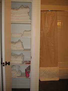 All the linens got put away on Wednesday, but I forgot to take a picture of them, so here they are. As you can see, 4 sets of towels pretty much fills up the closet. Of course, once we are using them, they will never all be put away, one set will always be out, even if it is clean. Unfortunately, Kai was so busy before the holidays, that he did not get a chance to finish putting up the towel rods. When he gets back, we will have to get that done. |