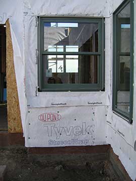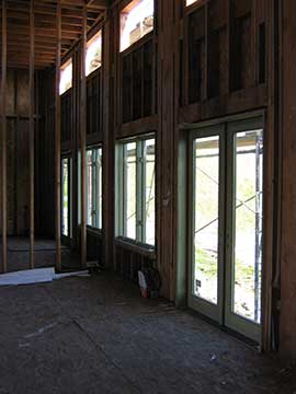 Here is another shot of the doors. You are looking at the family room and master bedroom doors out onto the veranda. While we were taking these shots, the sheet metal contractor arrived with the rest of the window and door pans—flashing necessary to install the doors and windows on the weather sensitive side of the house. |