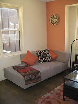 Here is the other couch and basket. We have found that there are pillows to match the blanket on the couch, but I am too cheap to buy them for now. We will have to muddle along with our$9 and $17 Cost Plus pillows as best we can. | |