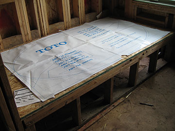 Kai had placed the pattern for the bathtub on the bathtub deck. I was amazed to see that they give you a paper pattern, shades of Buttrick or Vogue for the sewers amoungst us. The blue writing under the big word “Toto” is a list of models with arrows pointing to the proper silhouette. We have a Toto airbath—which is sort of like a jacuzzi but not quite so bubbly. I hope we like it. It is just goofy to buy something you will live with for the rest of your life from a low resolution photograph on the internet, but there is no other way. No one carries very many of these items—even the big, fancy bath and kitchen places. Dispite that, I do wish I had had a chance to do more looking in person before I got on the net, but oh well, too late now. |