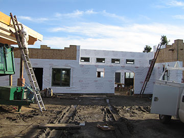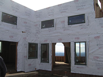 When I left the house this morning—at what my cousin likes to call o’dark thirty—it had been clear, but most of the way to the site there was fog, sometimes so dense I had to use my windshield wipers. When I got to the site, once again, we had our head above the fog at the site. Kai and his crew had been working on Tyvek wrap and windows since Monday, so they had made some good progress. |