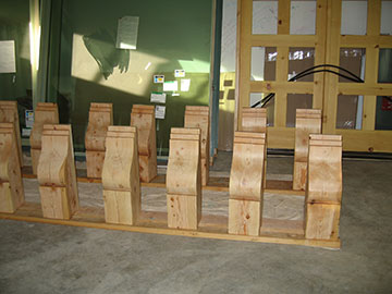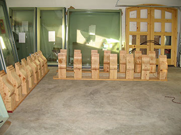 I went into the barn and there were my corbels—lined up like little soldiers, or Easter Island gods, or chess pieces, or—the list of similes goes on. Anyway, they looked terrific. The painters had done some more sanding on them with their amazing sanders and then finished them with the same clear, matte finish that we are using on all the interior pine. |