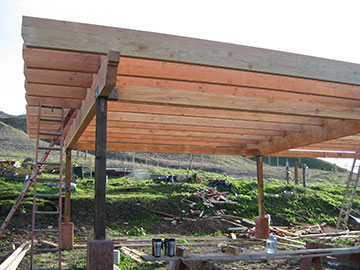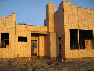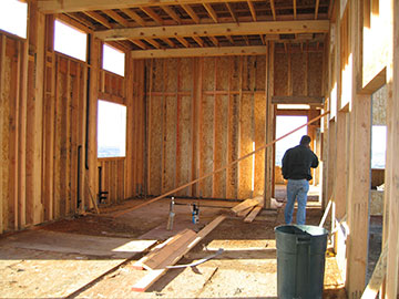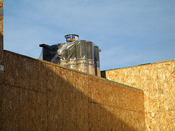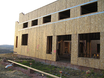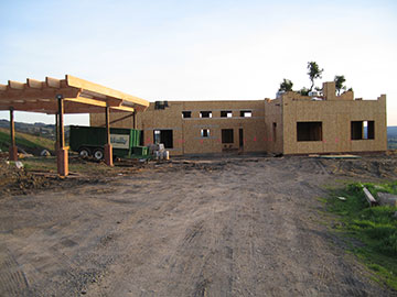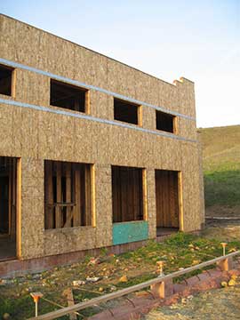 My alarm clock did not go off this morning—for the second day in a row—so I was a little late getting to the property. It was a beautiful, clear day, but very cold, hitting as low as 36° on the drive up. At the site, my car thermometer read 37°, but by mid-afternoon it was up to 67°—a 30 degree swing. Here is a photo I took from down below. The OSB (oriented strand board) really shines in the daylight and once we get the Tyvek on, it will really glow. I will be relieved to get the house plastered and a little more invisible. |