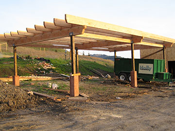 I had thought the posts for the carport seemed so massive until they put the beams and rafters up. Now the posts seem rather flimsy to be holding up all that roof. I was complaining to the painter today about the appearance of the pressure-treated posts, which had to be pressure treated because they are set in concrete. He suggested that we just stain them the same color as the barn. I thought that was a great idea and told him to go ahead. |