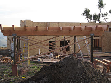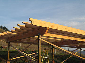 Here is the house end of the carport with the rafter additions installed. Thomas will cut the ends off flush with the lower part of the rafter next week. | |