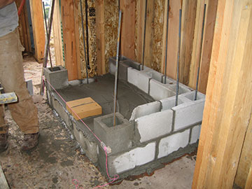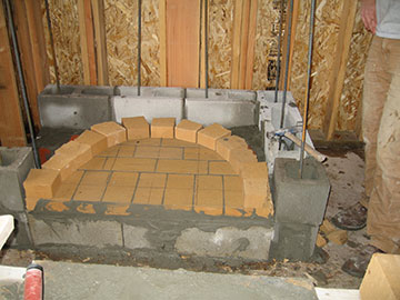 The masons left the fireplace at this stage because they need to wait for the plumber to install the gas line for the propane log. They left the arch to show me the shape of the firebox. | |