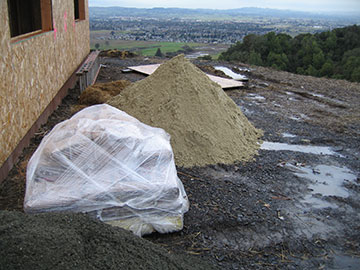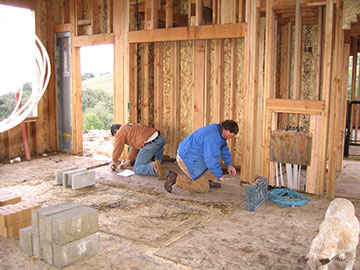 Meanwhile, Kai and Kevin laid out the fireplace on the floor. We had discovered that due to my poor communication to Abe, the drawing for the fireplace was incorrect. I explained to the masons what I wanted and they seemed to think it was no problem, so we decided to just work from the dimensions of the drawing but make the change on the fly. What I want is a kiva style fireplace, which is sort of beehive shaped. Abe and I had discussed flattening it because we thought it would save money, but then I designed a more conventional fireplace to use as the flat version and went back to the beehive kiva, but forgot to mention this to Abe. The masons didn’t think flat would be cheaper, so we went back to the beehive kiva-style fireplace. |