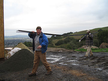 Here are the masons, Kevin and Kevin carrying rebar in for the masonry. Kai says he kids them by saying that they can never remember each other’s name. |