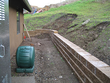 Over the weekend, between rain storms, my assistant had worked on raising the wall behind the cottage—and just in time, too. I was so relieved to arrive and see that done, because it meant that even if the slump at the corner got worse from more rain, it would be contained behind the wall. | |