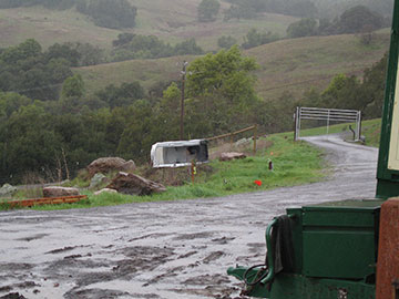 One good thing that happened is that I got to see our canale at work. It’s hard to see in this photo because of the low resolution, but despite the very heavy rain, the water was dripping straight off the canale onto the ground. Kai and Abe have been concerned that water would shoot out of the canale when it was raining heavily and missing the drain below. I thought that we could just contour the driveway in front of it so that no matter where it spouted to, the water would flow toward the drain. It looks like this will not be that important. My supposition is that the canale does not drain a large enough area of the roof to gather enough water to produce a shooting stream, even in a heavy rain like today’s. |
