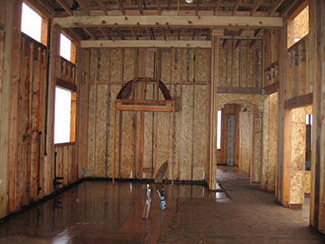 Wet as it is, you can see that the floors are all cleaned with the wood relayed. Kai has what looks like a lawn mower, but is really a huge rolling magnet on a stick. They roll this around to collect all the stray nails—and believe me, there were thousands. It is so important to get the nails up because if they are stepped on, they can nick the floor. | |