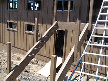 Back outside by the barn, Kai and his helper were working on the deck and staircase. In this picture, you can see the stair hangers have been installed. |