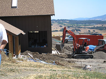 I got to the site right after lunch to find that the graders were there doing the site-work and installing the pipes for the roof drainage. They had already filled in between the two buildings. This area, which I call the breezeway, will be “tracked in”—which means they will run over the dirt with the machinery until it is compacted—then covered with DG (decomposed granite) so it can be used as a patio area. I am making canvas awning strips which can be attached between the buildings to shade it. There is often a breeze through it from the westerly winds we get every day, so the separate strips won’t form a sail and the wind can blow through them. |